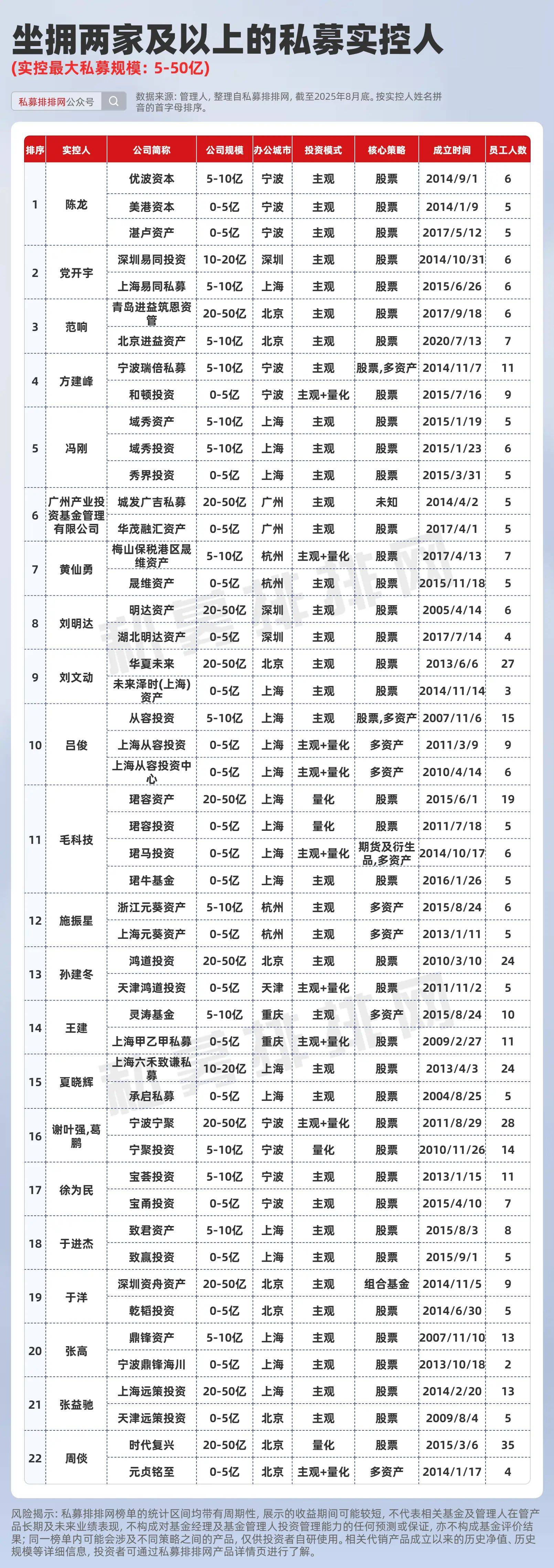 私募排排网数据显示,同时实控两家及以上私募,并且旗下有私募管理规模在5-50亿的实控人共22位。