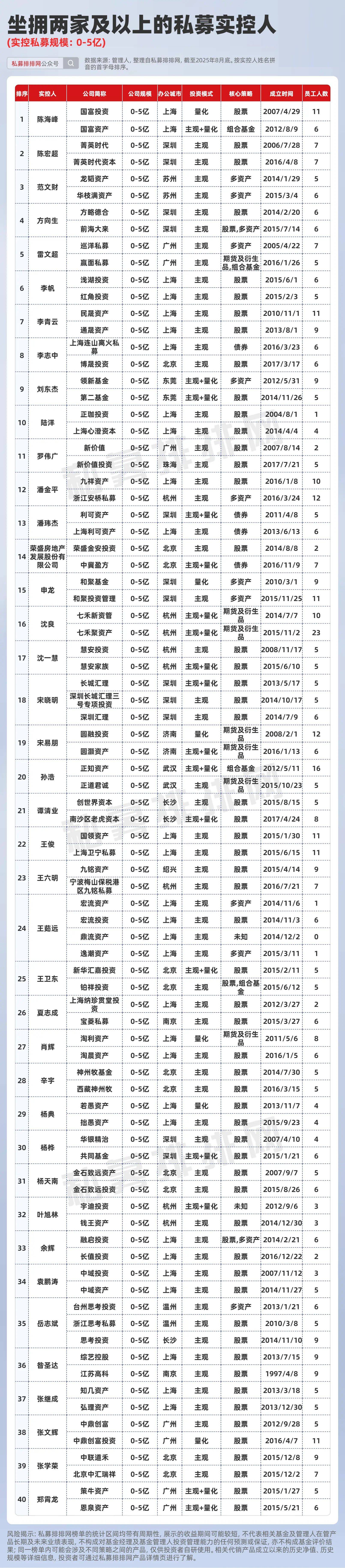 私募排排网数据显示,同时实控两家及以上私募,并且旗下私募规模均0-5亿的实控人共40位。
