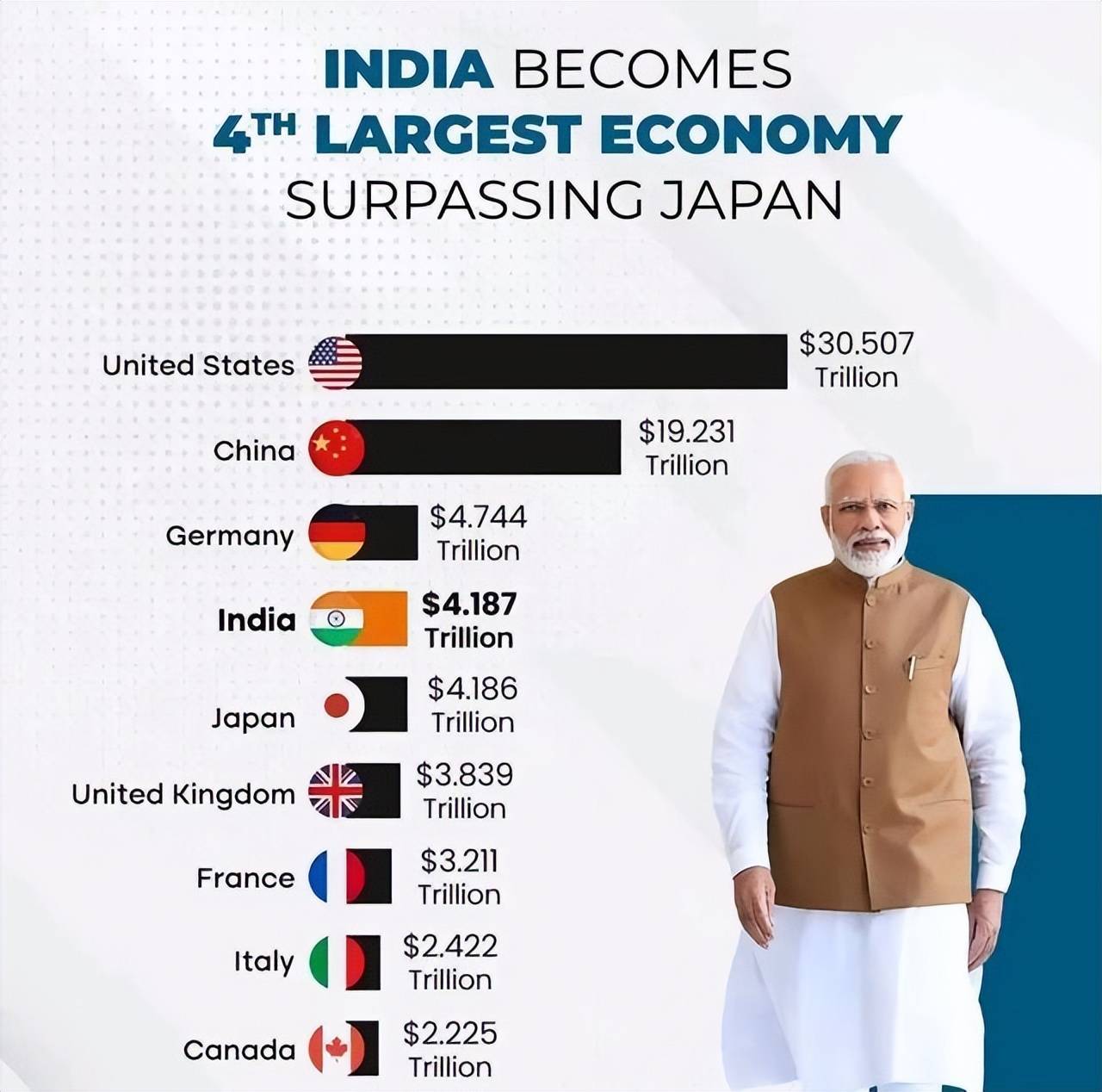 不过这个“超越”有几层原因。日本日元兑美元贬值挺厉害,以美元算的GDP就缩水了。印度这边央行稳住了卢比汇率,在名义数字上占了便宜。