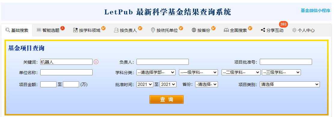 LetPub 的国家自然科学基金查询系统, 归纳了从1997年至2023年已获批准的自然基金项目, 提供科研学者进行在线查询。可以通过该系统进行2023年国家自然科学基金项目查询、在线查询国家自然基金结果、申请经验分享等功能。