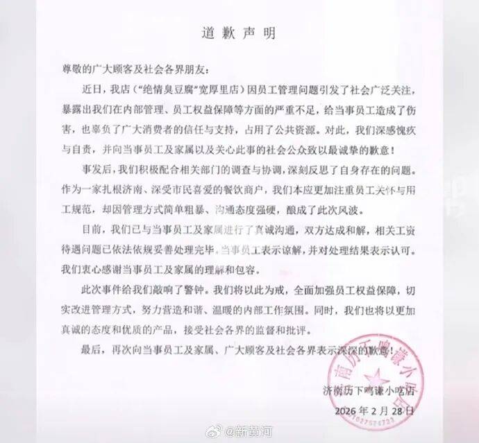 2026-03-01球速体育,球速体育官方网站,球速体育APP下载2月28日,济南宽厚里“绝情臭豆腐”店铺为父维权当事人发布声明,表示双方沟通后,已达成相互理解与和解。