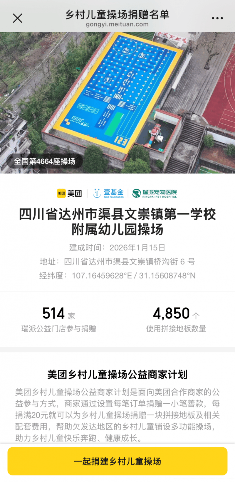 据悉,美团乡村儿童操场公益计划由美团联合壹基金于2020年共同发起,旨在为欠发达地区的乡村幼儿园铺设多功能操场,配备幼儿体育游戏综合器材包,并提供教师和园长培训,促进城乡学前教育均衡发展,助力乡村儿童健康成长。截至2026年3月底,该计划已在全国累计建成4877座,直接惠及65.9万名乡村儿童。此次瑞派捐建的操场,正是该项目落成的第4664座。